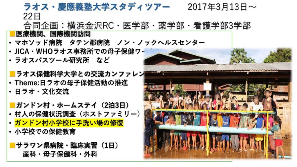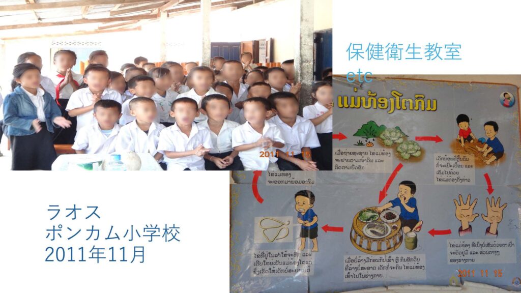 米山奨学生(fromラオス)との交流をきっかけに、会員がラオスを訪問し、2011年11月~2017年3月、ラオスの小学校にて、学習用品寄付等の学習環境整備、手洗い場設置などの衛生環境整備、手洗い教室や歯磨き教室などの衛生教育のお手伝いをさせていただきました。