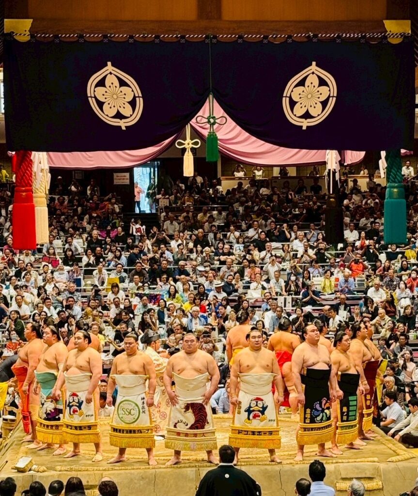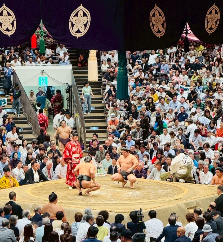 2025年9月25日 第2614回例会(移動例会) 大相撲秋場所観戦 こども相撲大会などでお世話になった高砂部屋の関取らに熱い声援を送りました!青少年交換留学生(fromカナダ)、米山奨学生(from韓国)ら留学生を招待し、日本の国技を生観戦してもらいました。