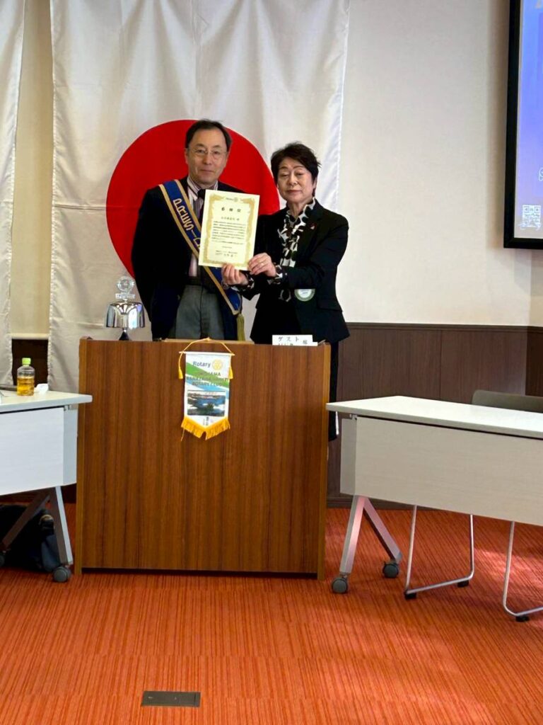 2025年12月4日 第2621回例会・新会員入会式 長寿会員表彰 卓話【イニシエーションスピーチ】 卓話【イニシエーションスピーチ】 夏季教職員企業研修受入れ企業、山本助産院に対してガバナーより感謝状授与